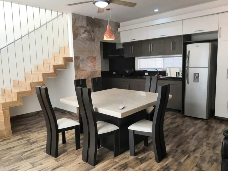 En RENTA y RENTA departamento de dos niveles, amueblado, en excelente ubicación a 5 minutos del puerto pesquero Sala, comedor, cocina integral con estufa y refrigerador, baño de visitas, patio y estacionamiento en la planta baja Dos recámaras con clóset y baño en planta alta, se aceptan mascotas